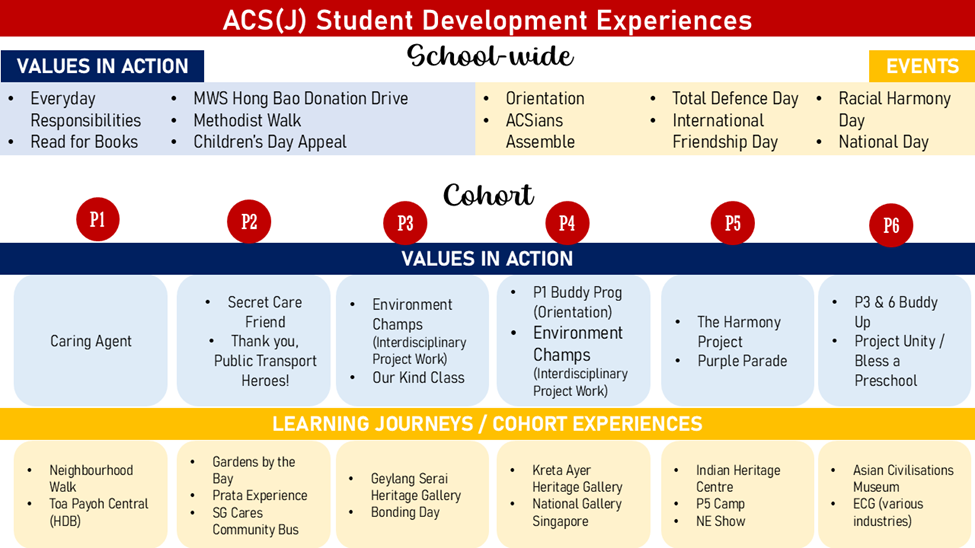 At ACS (Junior), we view the young gentlemen who pass through our gates as unique individuals, with different talents and strengths. We believe that each of them has the potential to flourish and live a fulfilling life as an individual, a family member, a friend, a community member, and a citizen of Singapore and the world. Through their everyday interactions with others and various learning experiences, we hope to guide them in developing their character and citizenship competencies and dispositions.