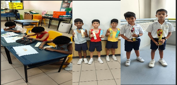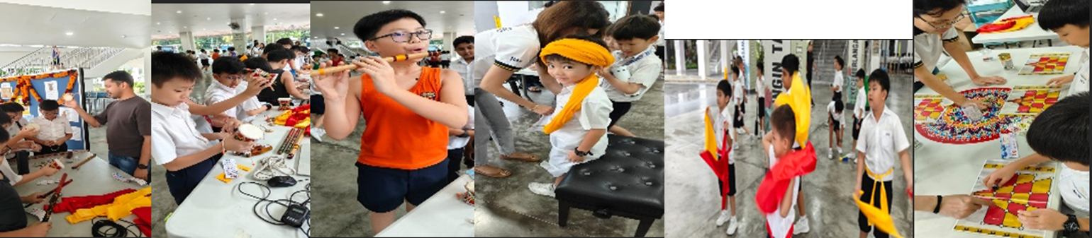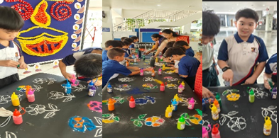During recess, students take part in Deepavali-themed activities that introduce them to the joy and significance of the Festival of Lights. Through simple traditional games, kolam designs, greeting card designing, students learn about Tamil culture in a fun and inclusive environment. These activities foster cultural appreciation, friendship, and festive cheer among all students.